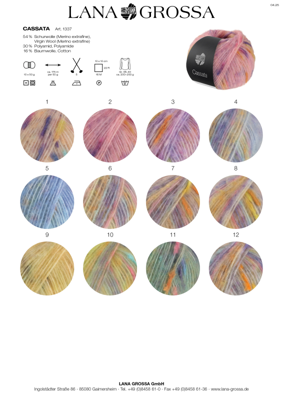 Mit Cassata bringt Lana Grossa ein Garn auf die Nadel, das Leichtigkeit, Volumen und Farbe in perfektem Zusammenspiel vereint. Die Mischung aus Baumwolle und Schurwolle sorgt für ein wunderbar weiches Tragegefühl und ein leichtes Maschenbild mit modernem Charakter.