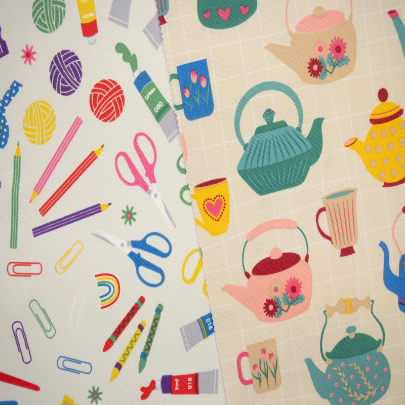Dekostoff mit Kannen und Tassen bunt Dekostoff mit Kannen und Tassen bunt